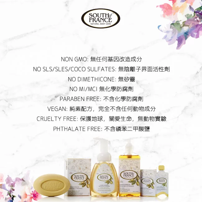 不含SLS/SLES、皂鹼、化學防腐劑、塑化劑、動物成分、石油成分、人工色素、人工香精